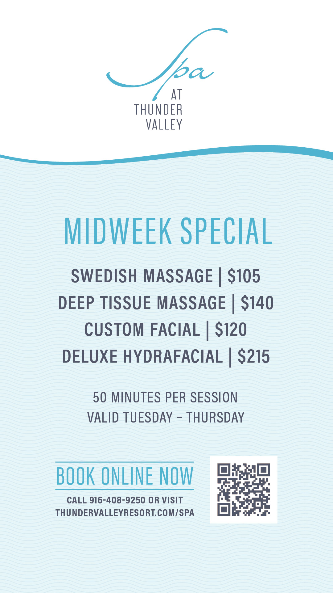 Spa at Thunder Valley brings you a full menu of incredible services and specials for your one-of-a-kind, Four Diamond spa enjoyment.